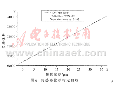 從最后獲得的極板位移與比率變壓器讀數(shù)的關(guān)系式(6)可知,讀數(shù)隨中心電極的位移呈線性變化。實際完成的系統(tǒng)由于結(jié)構(gòu)的不完善性,在接近量程的兩端會出現(xiàn)一定程度的非線性,如果采取等電位屏蔽等措施,可以把輸出特性的非線性降低到可以忽略的程度??梢?,將差動式電容位移傳感器與比率測量方法結(jié)合起來,設(shè)計的測量系統(tǒng)既有很高的分辨能力及較強的抗干擾能力,也能夠獲得很好的線性響應(yīng)。