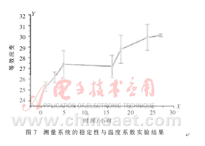 擬合方程顯示在圖中上部的方框里。從實驗結(jié)果可看出,一微米位移可獲得變壓器電橋讀數(shù),變化為127.02,輸出特性的非線性誤差小于0.15%F.S.。比率臂第五檔變化一個數(shù)對應(yīng)的位移量根據(jù)傳感器結(jié)構(gòu)的不同,一般在5~8納米之間,末級的數(shù)據(jù)采集器可獲得300多毫伏的輸出,從數(shù)據(jù)采集器便能夠分辨出0.02納米的變化。在實驗室環(huán)境下,傳感器測值隨著溫度的變化會產(chǎn)生極大的漂移,用標(biāo)準(zhǔn)元件來檢查變壓器電橋測量系統(tǒng)的溫度系數(shù)與穩(wěn)定性,所得結(jié)果見圖7。在28小時的實驗期間測值等效變化僅為0.1納米,環(huán)境溫度變化為3~4℃。作者還曾將差動電容式位移傳感器放到100米深的鉆井底部,那里溫度的年變化不到0.03℃,整個位移測量系統(tǒng)月漂 移率僅為0.1納米[3]。