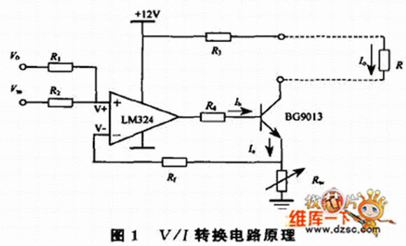 電壓/電流轉換即V/I轉換,是將輸入的電壓信號轉換成滿足一定關系的電流信號,轉換后的電流相當一個輸出可調的恒流源,其輸出電流應能夠保持穩定而不會隨負載的變化而變化。V/I轉換原理如圖1。