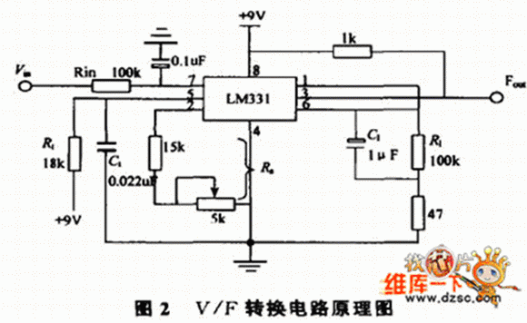 由Fout=?。郑椋?bull;Rs/(2.09•R1•Rt•Ct)可知,電阻Rs、R1、Rt和電容Ct直接影響轉換結果Fout,因此對元件的精度要有一定的要求,可根據轉換精度適當選擇,其中Rt、Ct、Rs、R1要選用低溫漂的穩定元件,Cin可根據需要選擇0.1uF 或1uF 。電容C1對轉換結果雖然沒有直接的影響,但應選擇漏電流小的電容器。電阻R1和電容C1組成低通濾波器,可減少輸入電壓中的干擾脈沖,有利于提高轉換精度。電路中的47Ω 電阻對確保電路線性失真度小于0.03% 是十分必須的。