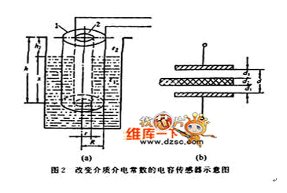 圖2是2種改變介質介電常數的電容式傳感器的原理圖。圖2(a)常用來檢測液位的高度,圖2(b)常用來檢測片狀材料的厚度和介電常數。