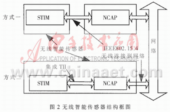 方案之一是無線STIM(智能傳感器接口模型):STIM與NCAP之間不再是TII接口(傳感器獨立接口),而是通過IEEE802.15.4無線(收發模塊)傳輸信息。傳感器或執行器的信息由STIM通過無線網絡傳遞到NCAP終端,進而與有線網絡相連。另外,還可以在NCAP與網絡間的接口替換為無線接口。