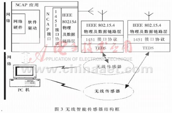 應用層(完成NCAP功能PC主機軟件)和無線傳感器終端模塊(智能傳感器接口模塊STIM)都通過IEEE1451接口協議與最低層的IEEE802.15.4模塊進行通信。