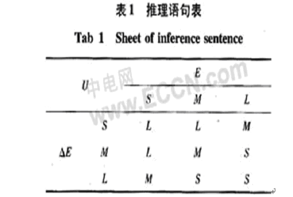 基于神經網絡在推理方面不足,故借助于模糊控制強大的推理功能,提取有效的條件語句,進而加快網絡的訓練速度。選取偏差E和偏差變化率△E作為輸入和控制量U作為輸出。偏差E和偏差變化率△E的模糊量分別為大(L),中(M),小(S),創立描述條件推理表格如表1。