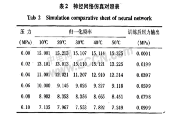 境下進行神經網絡的訓練和仿真,通過神經網絡工具箱,編制相應的仿真訓練程序,實現仿真過程。在仿真時,隨機選取幾組頻率-溫度作為輸入,最后,進行標定壓力值和仿真結果的比較。仿真數據結果如表2。