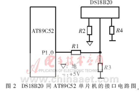 DS18B20的測溫原理為:內部計數(shù)器對一個受溫度影響的振蕩器的脈沖計數(shù),低溫時振蕩器的脈沖可以通過門電路,而當?shù)竭_某一設置高溫時,振蕩器的脈沖無法通過門電路。計數(shù)器設置為-55℃時的值,如果計數(shù)器到達0之前門電路未關閉,則溫度寄存器的值將增加,這表示當前溫度高于-55℃。同時,計數(shù)器復位在當前溫度值上,電路對振蕩器的溫度系數(shù)進行補償,計數(shù)器重新開始計數(shù)直到回零。如果門電路仍然未關閉,則重復以上過程。溫度轉換所需時間不超過750ms,得到的溫度值的位數(shù)因分辨率不同而不同[2]。DS18B20同AT89C52單片機的接口電路如圖2所示。這種接口方式只需占用單片機一根口線,與智能儀器或智能測控系統(tǒng)中的其它單片機或DSP的接口也可采用類似的方式。