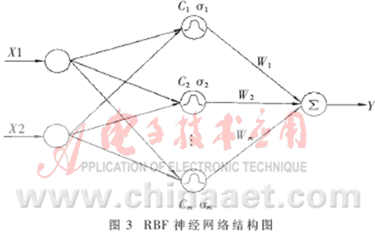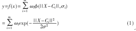 上式中,m是隱含層結點數(shù);||•||是歐幾里德范數(shù);X,Ci∈Rn, ωi是第i個基函數(shù)與輸出結點的連接權值(i=1,2,...,m)。
