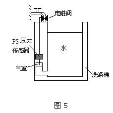 圖5是PS壓力傳感器在全自動洗衣機(jī)中的應(yīng)用實例。如圖所示,利用氣室,將在不同水位情況下水壓的變化,作為空氣壓力的變化檢測出來,從而可以在設(shè)定的水位上自動停止向洗衣機(jī)注水。