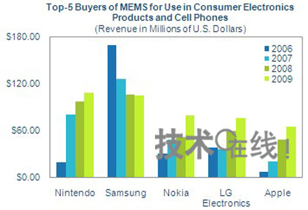 美國iSuppli透露,2009年消費類電子產(chǎn)品與手機MEMS部件的最大買家是任天堂。任天堂在提高游戲機“Wii”遙控器動作識別精度的附件“Wii MotionPlus”中采用了陀螺儀(角速度傳感器),使得MEMS購買額比上年增加11.9%,達到1億800萬美元。超越了此前兩年內(nèi)一直穩(wěn)居榜首的韓國三星電子。緊隨其后的是名列第三的芬蘭諾基亞、位居第四的韓國LG電子以及位列第五的美國蘋果公司。