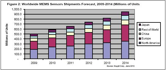 鑒于中國汽車出貨量迅速增長,在該地區(qū)已經建立據點的供應商,如Bosch和Continental,都逃過了經濟衰退的最嚴重影響。2009年中國市場占總體MEMS消費量的11%,未來幾年將繼續(xù)增長,到2014年將成為全球第三大市場,領先于日本和“世界其它地區(qū)”。iSuppli公司認為,這些動態(tài)未來五年對于MEMS傳感器供應商來說是好消息。