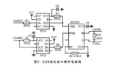 CAN通訊網(wǎng)絡(luò)模塊負(fù)責(zé)將啟動(dòng)信號(hào)和檢測(cè)信號(hào)通過CAN網(wǎng)傳輸給汽車的中央處理器。中央處理器通過接收的信號(hào)做決策判斷。CAN總線通信方式靈活、抗干擾能力強(qiáng),目前在汽車控制系統(tǒng)中應(yīng)用廣泛。CAN通訊接口硬件設(shè)計(jì)如圖3所示,其中82C250是CAN控制器和物理總線間的接口,它和CAN控制器之間采用光隔P113來提高系統(tǒng)的抗干擾能力。