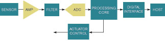 傳感器的模擬信號必須經(jīng)過數(shù)字化才能供系統(tǒng)使用,并且信號要經(jīng)過放大、濾波和數(shù)字化(圖1)。每一級通常都涉及一只圍繞著一些無源元件的器件,以正確地實(shí)現(xiàn)一個(gè)應(yīng)用。一旦對信號做了數(shù)字化,就可以將其送給微處理器上的控制系統(tǒng),或整理數(shù)據(jù)后通過一個(gè)通信協(xié)議送至一只主處理器。協(xié)議可以根據(jù)需要使用傳感器數(shù)據(jù)。