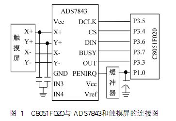 ADS7843是一種四線式觸摸屏控制器,目前較多應用于電阻式觸摸屏輸入系統(tǒng)中。盡管有很多相關的典型應用和應用注意事項,但是在實際使用過程中仍然會遇到一些問題。應用在通用的單片機中所出現(xiàn)的問題及解決方法,已有一些介紹。本文是對基于高速、流水線結構的 C8051的觸摸屏控制系統(tǒng)設計中所遇到的問題進行分析處理,并給出了解決方法。