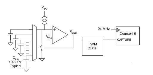 該比較器的輸出被作為一個脈沖寬度調制器(PWM)電路的時鐘輸入信號,它負責選通一個頻率為24兆赫茲的16位計數器。手指接觸傳感器時會增加電容,從而增加計數器的總值。這就是一個手指如何被感覺到方式。這個系統的典型波形如圖4所示