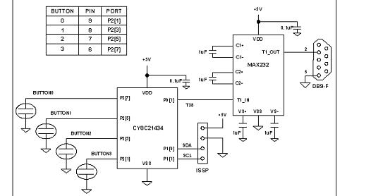 為實現電容式傳感和串行通信,電路設計中采用了賽普拉斯公司的CY8C21x34系列的PSoC芯片,其中包含了一組模擬和數字功能模塊,它們由存儲在板載閃存中的固件來設置。第二個芯片處理RS232電平移位,以提供與一臺主機的通信鏈路,使電容式傳感數據記錄通過串口以115200波特率傳輸給主機。四個電容傳感按鍵的引腳分配顯示在圖5中的表中。通過ISSP接口和編程引腳SCL、SDA對PSoC進行編程。ISSP接口中包含電源和地,而PC主機連接到電容式傳感電路板通過標準的DB9連接器。