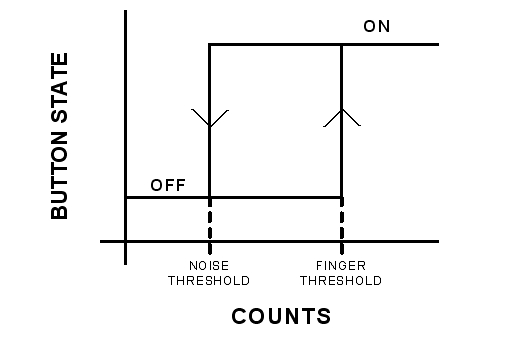 該轉移函數中的遲滯提供了開關狀態之間的干凈利落的轉換,即使計數是有噪聲的情況下也不例外。這也為按鍵提供了一種反跳功能。低門限被稱為“噪聲門限”,而高門限則被稱為“手指門限”。門限水平的設定決定了系統的性能。當覆蓋層非常厚時,信噪比很低。在此類系統中設定門限水平是一項具有挑戰性的工作,而這恰好是電容式傳感設計技巧的一部分。