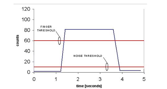 同時還給出了門限值。噪聲門限被設定的計數值為10,而手指門限設定的計數值則為60。實際上,在實際計數數據中始終存在噪聲分量,圖中并未顯示,以便能清晰地顯示門限水平。