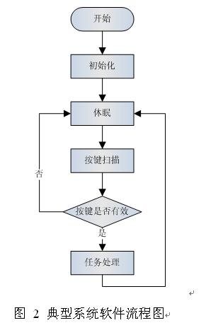 圖2是一個具有休眠功能的典型系統軟件流程圖。系統初始化后進入休眠模式,經過一段時間的延時后喚醒掃描按鍵模塊,進行按鍵掃描。如果有按鍵按下,軟件判斷是否有效。如果無效按鍵按下,那么系統繼續進入休眠模式。如果軟件判斷按鍵有效,那么喚醒系統,觸發任務處理進程。當處理完所有任務后,系統又重新進入休眠狀態。這是個典型的具有休眠功能的系統工作流程圖,它的優點就是此軟件流程簡單易懂、容易實現,一般可以滿足大多數場合的應用。但是,如果系統任務處理消耗了較多的CPU處理時間,那么為了達到目標平均工作電流,就需要相應增加休眠時間。同時降低了按鍵掃描的頻率,從而加長了系統喚醒的響應時間。因此,此方法適合比較簡單的、系統任務不復雜的應用。