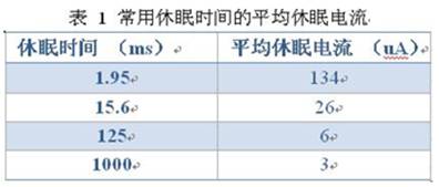 CY8C22x45系列芯片休眠時的工作電流僅有3uA[5],芯片內包含一個休眠計數器,系統進入休眠后計數器開始遞減,當計數值為零時產生中斷喚醒系統。喚醒系統后可以不做任何處理再次進入休眠模式。這樣周而復始,達到所需要的整個休眠時間。在實際設計中,常常使用平均休眠電流替代公式2中的Isleep,即在每次休眠結束后,僅讓系統正常工作最短時間,該時間內完成所有必須操作(僅是一次循環判斷),此時的電流即為該休眠時間下的平均休眠電流。表1列出了常用休眠時間的平均休眠電流。