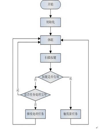 圖3是一個具有休眠功能的復雜系統軟件流程圖。此方法是將以上方法中的任務處理進行分解,分為觸發新任務,處理任務。目的就是減小在每個循環周期內部執行任務的所花費的CPU資源。與上一個方法的不同在于:系統喚醒掃描按鍵程序,當判斷按鍵有效時,觸發新任務,并不是將所有的任務處理完畢。在當前的循環周期內,觸發的新任務可能沒有處理完畢,需要下一個或者更多個系統循環的時間才可以完成。當判斷按鍵無效時,不是馬上進入休眠模式,而是判斷是否有沒有處理完畢的任務。如果有則繼續處理;如果沒有則進入休眠模式。此方法可以處理比較復雜的任務,能滿足更多應用領域的需求。