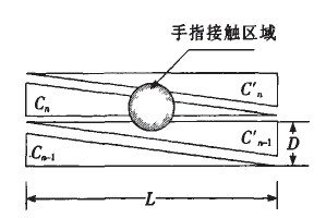 Ca(n)、Cb(n)、為第一組感應電極,Cb(n)、Cb(n)''''為第二組感應電極,Ca(n)''''、Cb(n)''''為第三組感應電極,分別感應X1、X2、X3范圍內坐標點的位置。具體坐標計算方法與上述類似。設計中需要注意X1、X2、X3每組電極的寬度應與手指接觸面積的寬度相當,如寬度不足則需要增加菱形電極,否則手指接觸在相同區域內無法識別兩個感應點。