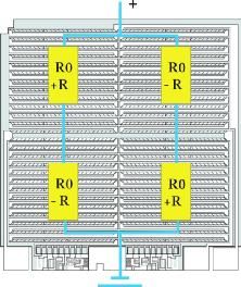 現(xiàn)代傳感器系統(tǒng)主要由兩個元件組成 —基本傳感器和信號處理專用集成電路 (ASIC)(圖 1)。現(xiàn)已證明,后來由 Lord Klevin 于 1857 年發(fā)現(xiàn)的各向異性磁阻效應(yīng)特別適用于檢測磁場。首先考慮通常具有多種磁疇結(jié)構(gòu)的鐵磁性材料。這些稱之為韋斯磁疇的結(jié)構(gòu),其內(nèi)部磁化的方向彼此不同。如果將這種材料平鋪為一薄層,那么磁化矢量處于材料層平面方向。另外,可較精確地假設(shè)只存在一個磁疇。當(dāng)這種元件暴露于外部磁場中時,后者會改變內(nèi)部磁化矢量的方向。如果同時一股電流通過該元件,就會產(chǎn)生電阻(圖 2),這取決于電流和磁化之間的角度。當(dāng)電流和磁化方向彼此成直角時,電阻最小,當(dāng)二者平行時,電阻最大。電阻變化的大小取決于材料。鐵磁性材料的性質(zhì)也決定對溫度的依賴性。電阻最大變化為 2.2% 并且對溫度變化反應(yīng)良好的最佳合金是 81% 的鎳和 19% 的鐵組成的合金。恩智浦所有傳感器系統(tǒng)中的基本傳感器都采用這種強(qiáng)磁鐵鎳合金。在惠斯登電橋電路中單獨配置幾個 AMR 電阻,以增強(qiáng)輸出信號并改善溫度反應(yīng)特性。此電路也可在制造過程中進(jìn)行微調(diào)。圖 3 顯示如何在裸片上配置 AMR 元件。