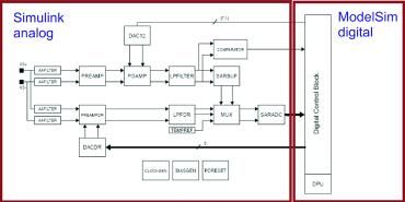 確定磁場之后是傳感器系統(tǒng)仿真。AMR 元件的電阻變化是各向異性磁阻效應(yīng)的直接結(jié)果。這樣,磁場仿真的結(jié)果會導(dǎo)致代表信號處理中輸入信號的電阻發(fā)生變化。對模擬前端進(jìn)行建模可采用 Simulink。這種行為模型是概念設(shè)計的產(chǎn)物,標(biāo)志著產(chǎn)品開發(fā)的起點。每個 Simulink 塊對應(yīng)一個模擬信號處理組件,例如放大器或過濾器。但是,尚未考慮模擬組件的控制部分,這由數(shù)字系統(tǒng)實現(xiàn)。HDL 設(shè)計則仿真通過數(shù)字方法實現(xiàn)的功能,而且在完成產(chǎn)品開發(fā)之后就會最終成形。因此,整體系統(tǒng)仿真是 Simulink 對模擬組件的行為模型以及 ModelSim 對 HDL 設(shè)計的共同仿真(圖8)。可通過仿真從概念階段順利過渡到 HDL 設(shè)計及后續(xù)階段。在共同仿真中,可用 ModelSim 中部署的 Verilog 代碼逐漸代替 Simulink 參考模型,從而可逐項驗證 HDL 設(shè)計。可持續(xù)進(jìn)行此過程,直到在 Verilog 中實現(xiàn)整個數(shù)字部件,而模擬系統(tǒng)部件仍保持為 Simulink 模型。此工具組合也已證明對 IC 評估同樣有用。自始至終使用這種工具可以更容易理解 IC 行為,并可創(chuàng)建用來分析和解釋任何錯誤的框架。這些工具的主要好處在于,能夠更快速、更準(zhǔn)確地答復(fù)客戶的查詢,以及更好地了解與環(huán)境條件相關(guān)的傳感器功能。