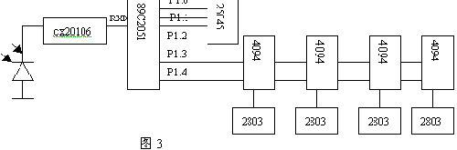 接收器部分,主要由CX20106和89C2051、顯示驅動4094、2803及數(shù)據(jù)存儲器和看門狗25045組成,用解碼芯片CX20106把38K的載波過濾后,得到一組波形,即以波特率為1200的串口數(shù)據(jù),直接送至89C2051的RXD接收,用軟件讀取串口,輸入緩存,得到一組數(shù)據(jù),判斷正確后,存放在非易失性的EEPROM25045中,同時直接用脈沖移位方式,送數(shù)據(jù)至4094,經(jīng)2803驅動后顯示,同時用25045的看門狗定時,保證在程序失控等情況下,能正確返回而不造成錯誤接收。由于串行口方式傳輸,本身帶有奇偶校驗和起停位校驗,可以大大提高數(shù)據(jù)的可靠性,同時在數(shù)據(jù)組中還加入了累加和校驗,再次提高了可靠性,因此在實際應用中,即使在露天、太陽直射、光照很強等惡劣環(huán)境下,都能保證不會誤收數(shù)據(jù)而造成顯示錯誤。其原理圖如下: