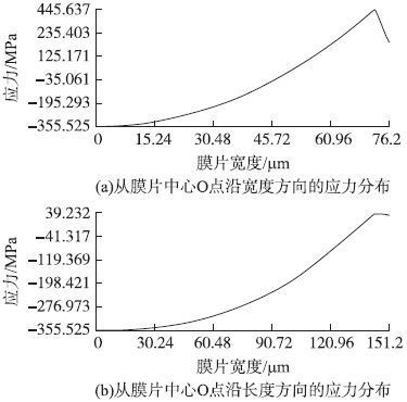 犧牲層厚度H2 < 1.6 μm 時,隨著犧牲層厚度的減小,使膜片與襯底剛好接觸所加載的壓力也隨之減小,當犧牲層厚度減小使該加載壓力減小到剛好滿量程壓力時,犧牲層厚度不可再減小,否則傳感器在量程范圍內將出現了非線性形變,這樣便確定了減小犧牲層厚度提高過載能力的極限值。經過仿真,膜片長度a = 300 μm、寬度b = 150 μm、膜片厚度H1 = 3 μm 時,對應的犧牲層厚度最小值為0.3μm。下面利用有限元分析軟件對此參數的壓力傳感器進行非線性接觸分析。按照模型建立、網格劃分、接觸對建立、加載、求解的順序進行模擬仿真。當最大應力達到硅的斷裂強度時,加載壓力為1.55MPa,仿真結果如圖4 所示,其中點O 處于膜片中心。
