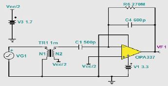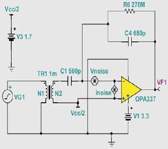 為了獲得更為實際的電路實施,我們選用了TI的OPA337.這款放大器擁有低輸入電壓和低輸入電流噪聲(請參見圖5),同時接受3V單極電源。圖6顯示了TI SPICE型仿真程序中這種電路的模型,即TINA-TI.