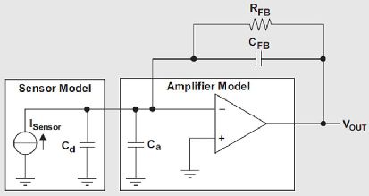 信號調節電路必須具有非低的輸入阻抗,以收集傳感器的大部分電荷輸出。因此,電荷放大器是理想的解決方案,因為只要放大器在這些信號頻率下保持高增益,其輸入便會讓傳感器信號出現虛擬接地。換句話說,如果傳感器的任何電荷想要在傳感器陽極(Cd)或者放大器輸入寄生電容(Ca)上增大,在放大器輸入端就會形成電壓。通過拉或吸取相同量的負反饋網絡電荷電流,即RFB和CFB,這種電壓便立即得到了補償。