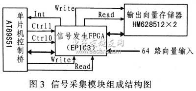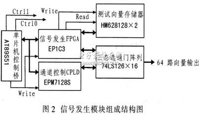該模塊由單片機(jī)控制橋(AT89S51)、測(cè)試向量存儲(chǔ)器(靜態(tài)存儲(chǔ)器HM628128x2,排列方式為256 Kx8 bit)、信號(hào)發(fā)生FPGA(Altera公司Cyclone系列PLD器件EP1C3)、通道控制CPLD(Altera公司MAX7000系列PLD器件EPM7128S)及三態(tài)選通門陣列(74LS126x16)組成,模塊組成結(jié)構(gòu)如圖2所示。