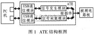 ATE測(cè)試的原理就是向電路板輸入測(cè)試向量,獲取相應(yīng)的輸出向量,將此輸出向量與正常的響應(yīng)向量相比較,結(jié)果一致表明電路板無(wú)故障,否則表明該電路板已損壞。整個(gè)過程由ATE自動(dòng)完成,因此效率高,但測(cè)試向量的完備與否對(duì)故障診斷結(jié)果有重要影響。該ATE設(shè)備是針對(duì)某電子裝備系統(tǒng)而研發(fā)的,其結(jié)構(gòu)框圖如圖1所示。