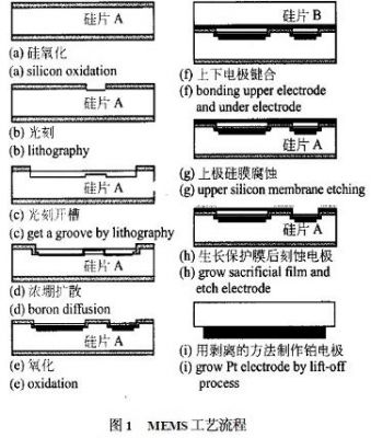 硅電容式壓力傳感器的敏感元件是半導(dǎo)體薄膜,它可以由單晶硅、多晶硅等利用半導(dǎo)體工藝制作而成。典型的電容式傳感器由上下電極、絕緣體和襯底構(gòu)成。當(dāng)薄膜受壓力作用時,薄膜會發(fā)生一定的變形,因此,上下電極之間的距離發(fā)生一定的變化,從而使電容發(fā)生變化。但電容式壓力傳感器的電容與上下電極之間的距離的關(guān)系是非線性關(guān)系,因此,要用具有補償功能的測量電路對輸出電容進行非線性補償。由于高溫壓力傳感器工作在高溫環(huán)境下,補償電路會受到環(huán)境溫度的影響,從而產(chǎn)生較大的誤差。基于模型識別的高溫壓力傳感器,正是為了避免補償電路在高溫環(huán)境下工作產(chǎn)生較大誤差而設(shè)計的,其設(shè)計方案是把傳感器件與放大電路分離,通過模型識別來得到所測環(huán)境的壓力。高溫工作區(qū)溫度可達350℃。傳感器件由鉑電阻和電容式壓力傳感器構(gòu)成。其MEMS工藝如下: