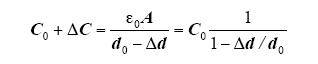為提高傳感器的靈敏度K,提高精度、減小非線性誤差&,電容傳感器大都采用差動式結(jié)構(gòu)。在差分電容傳感器中,當(dāng)動極板的移動距離為Dd時,電容C1的間隙d1變?yōu)閐0-Dd,電容C2的間隙d2變?yōu)閐0+Dd。