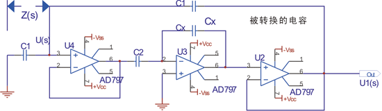。如果 Rf 為常數(shù),則f是Cx(x)函數(shù),可根據(jù)測定f占空比,計算出Cx(x)的值。實際上,圖3電路僅可測量靜態(tài)電容,對于測量動態(tài)電容,必須對電路進行改進, 對Cx的電荷轉(zhuǎn)移過程進行保護。改進的方法是用電容性有源網(wǎng)絡(luò)在電路中來代替Cx,如圖4所示。U3是電荷轉(zhuǎn)移放大器,是網(wǎng)絡(luò)的中心;U2是跟隨器;U4是保持器,電路靜態(tài)諧振頻率以38KHz~40KHz為好。