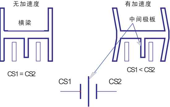 如圖5所示,中間極板(即橫梁的伸出部分)與二個固定的外極板組成差動電容 CS1和CS2。沒有加速度時,CS1=CS2;產(chǎn)生加速度時,橫梁的移動改變了中間極板和固定的外極板之間的相對位置,引起電容變化,CS1≠CS2。通過測量電路,將電容的變化在外加交流電壓的激勵下轉(zhuǎn)化為電學(xué)量,能夠測得該物體相應(yīng)的瞬時速度或瞬時加速度值。
