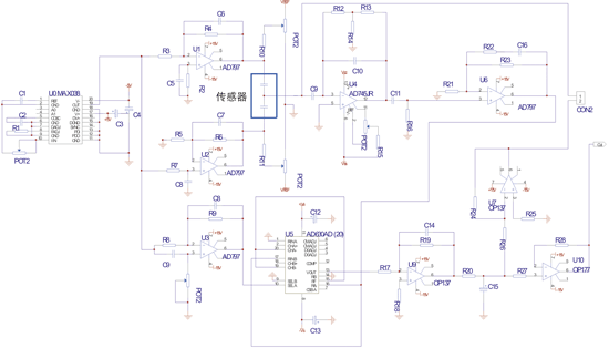 具體電路如圖7所示:U0(MAX038)信號發(fā)生器芯片產(chǎn)生1MHz的正弦交流信號;U1(AD797)運算放大器組成反相比例放大器,U2(AD797)運算放大器組成同相比例放大器。1MHz的交流信號經(jīng)U1、U2后,變?yōu)榇笮∠嗟取⒎较蛳喾础⑾辔幌嗖?80o的二個交流激勵信號,用來激勵差分電容傳感器;U4(AD745JR)是高輸入阻抗電荷轉(zhuǎn)移放大器。U4是調(diào)理電路的中心,在外加激勵信號的作用下,傳感器振動引起的電荷轉(zhuǎn)移成電壓信號的變化。R12、R13、R14采用T型連結(jié),目的是提升電路阻抗和電路系統(tǒng)放大倍數(shù)。U6(AD797)運算放大器是 將C11、R16組成的高通濾波器去除低頻干擾后的電壓信號經(jīng)適當(dāng)放大,為下一步同步解調(diào)作好準(zhǔn)備;U3(AD797)運算放大器組成的移相電路,其作用是使調(diào)制信號和解調(diào)信號同步;U5同步解調(diào)器,采用ADI公司生產(chǎn)的平衡解調(diào)器AD630,經(jīng)U5同步解調(diào)出的電壓信號就是反應(yīng)振動加速度大小的信號;U9(OP137)運算放大器組成二階有源低通濾波器,濾除信號中高頻噪音成份;U10(OP177)運算放大器組成 跟隨器,信號經(jīng)調(diào)整后跟隨輸出。