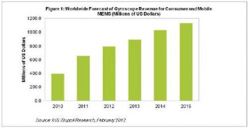 據IHS iSuppli公司的MEMS市場追蹤報告,由于蘋果iPhone和iPad去年第四季度創出最高銷量紀錄,2011年陀螺儀成為消費與移動MEMS領域中的創收大戶。