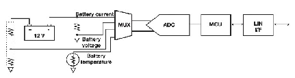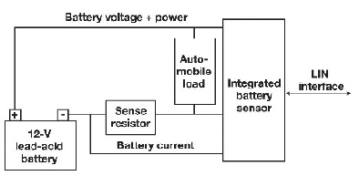 電池電壓通過一個直接從電池正極分接出來的阻性衰減器來檢測。為檢測電流,將一個檢測電阻(12V應(yīng)用一般使用100mΩ)放在電池負(fù)極與地之間。在這種配置中,汽車的金屬底盤一般為地,檢測電阻安裝在電池的電流回路中。在其它配置中,電池的負(fù)極是地。對于SoH 計算,還必須檢測電池的溫度。