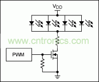 許多顯示屏模塊如今都配有一個(gè)集成控制器,用戶(hù)可以通過(guò)向控制器發(fā)送串行命令,直接設(shè)置背光亮度。如果顯示屏模塊未配備集成控制器,還可安裝一個(gè)簡(jiǎn)單的背光控制執(zhí)行器,控制顯示屏后面用于背光照明的白光LED燈的輸入電流。實(shí)現(xiàn)這種控制的一種簡(jiǎn)單辦法是:直接給LED串聯(lián)一個(gè)場(chǎng)效應(yīng)晶體管(FET),使用PWM信號(hào)快速打開(kāi)、關(guān)閉FET (圖5)。然而,也可以利用單一芯片(用于LED控制的MAX1698升壓轉(zhuǎn)換器)準(zhǔn)確、可靠地調(diào)節(jié)(圖6),請(qǐng)參考應(yīng)用筆記3866“Low-power PWM output controls LED brightness”,獲取詳細(xì)信息。