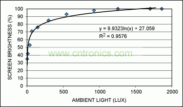 最后一步就是在傳感器和執(zhí)行器之間建立連接,通過(guò)微控制器實(shí)現(xiàn)。有人可能首先要問(wèn):“環(huán)境光強(qiáng)如何映射到背光亮度?”事實(shí)上,有些文獻(xiàn)專(zhuān)門(mén)介紹了相關(guān)方案。其中一種映射方式是,Microsoft®針對(duì)運(yùn)行Windows® 7¹操作系統(tǒng)的計(jì)算機(jī)提出的。圖7所示曲線(xiàn)是由Microsoft提供的,它可以將環(huán)境光強(qiáng)度映射到顯示屏亮度(以全部亮度的百分比表示)。