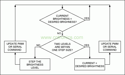 最好不要從一個(gè)亮度級(jí)直接跳轉(zhuǎn)到另一個(gè)亮度級(jí),而是平滑上調(diào)和下調(diào)背光亮度,確保不同亮度等級(jí)之間無(wú)縫過(guò)渡。為了達(dá)到這一目的,最好采用帶有固定或不同亮度步長(zhǎng)、可逐步調(diào)節(jié)亮度的定時(shí)中斷,也可采用帶有可控制LED輸入電流的PWM值的定時(shí)中斷,或者是能夠發(fā)送到顯示屏控制器的串行指令的定時(shí)中斷。圖8提供了這種算法的一個(gè)示例。
