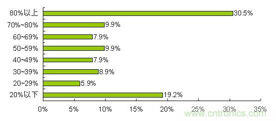 根據調查,89%的公司2011年傳感器采購總額在5千萬以下,其中采購總額在1千萬以下的占到69%。采購傳感器進口產品所占百分比呈現兩極分化,進口產品所占百分比在80%以上和20%以下的情況最多,有30.5%的整機制造商傳感器進口產品達到80%以上,19.5%的公司進口產品在20%以下。