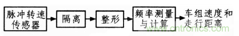 從上式可知,測量列車速度就是檢測列車車輪轉速和列車輪徑。脈沖轉速傳感器安裝在輪軸上,輪軸每轉動一周,傳感器輸出一定數目的脈沖,使脈沖頻率與輪軸轉速成正比。輸出的脈沖經隔離和整形后直接輸入計算機CPU進行頻率測量,再經換算從而得出車組速度和走行距離閉。其原理框圖如圖1所示。
