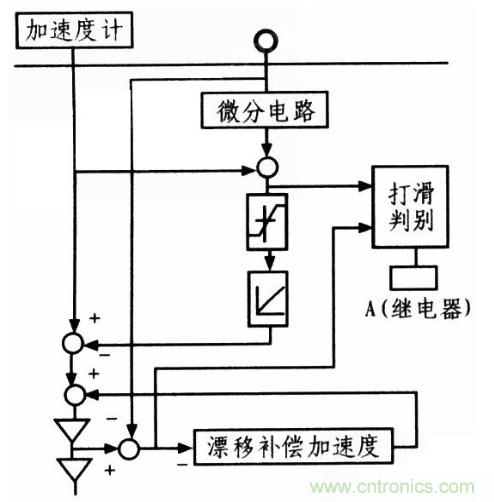輪軸脈沖轉速傳感器也存在一定缺陷:即車輪空轉或打滑會使列車速度的測量結果存在誤差,為解決此類問題,在列車車軸上加裝一個加速度傳感器,配合脈沖轉速傳感器使用。該方式工作原理:在列車打滑期間,把機車的內加速度作為測速的信息源,該信息與車輪旋轉的狀態(tài)等信息不相關,而在其余工作時間仍用輪軸脈沖傳感器測速,所以該方式稱為基于慣性加速度傳感器的測速。在車輪打滑時,由加速度傳感器測得加速度及車輪打滑前加速度的傾斜分量,而計算出車輪打滑時的列車運行加速度,再將該值積分即得車輪打滑時列車實時運行的速度。具體原理如圖2所示。