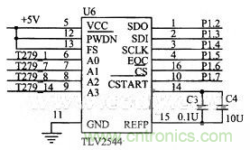 TLV2544是TI公司生產的高性能12位低功耗、高速(3.6μs)CMOS模數轉換器,具有采樣一保持功能,電源電壓為2.7~5.5V。TLV2544還具有3個輸入端和1個三態輸出端,可為最流行的微處理器串行端口(SPI)提供4線接口。器件在上電初始化時首先需要將初始化命令A000h寫入CFR配置寄存器,然后,對器件進行編程,其編程方法是在初始化命令A000h的低12位000h寫入編程數據以規定器件的工作方式。TLV2544具有4種轉換模式:單次模式、重復模式、掃描模式和重復掃描模式,可用模式00.01,10,11表示。圖1為TLV2544和單片機AT89C2051的接口電路。該電路采用外部基準,REFP與REFM之間接0.1μF和10μF2只去耦電容器。
