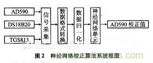 本文采用三層前向網絡,輸入層神經元2個,分別代表溫度傳感器ADS90和氣體傳感器TGS813輸入信號,DS18B20的測量值作為AD590的期望值,輸出層神經元1個,代表AD590的校正值。
