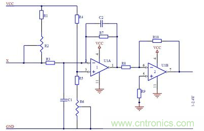 信號(hào)調(diào)理電路中還設(shè)計(jì)濾波電路,是為了濾去測(cè)量現(xiàn)場(chǎng)的干擾,例如電氣干擾、電磁干擾,使系統(tǒng)的信噪比增加。如圖2所示,電阻R2和電容C1組成簡單的無源RC低通濾波器。電阻R3、R7,電容C2及運(yùn)放組成一階反相輸入RC有源低通濾波器,有源濾波器比無源濾波器具有更優(yōu)越的性能,提高了頻率特性值,改善了選擇性。