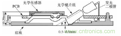 圖1為鼠標芯片的安裝裝配圖。因OM02芯片為COMS型傳感器,因此必須配備有與之相適應的高強度發光二極管,發射角度與底板夾角30。~45。 范圍內。在標準安裝配合后,底板距離工作表面的有效距離在0mm~2mm內,OM02芯片可進行正常的數據接收檢測。